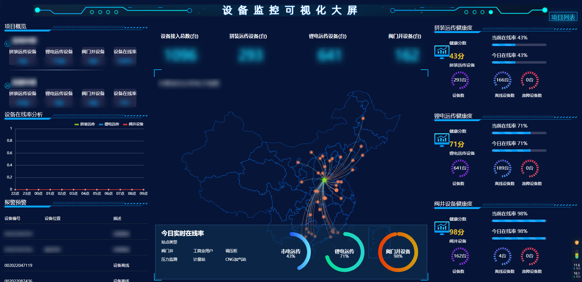- 4、動態展示設備在線率折線圖分析,以餅狀圖展示今日實時在線率情況。